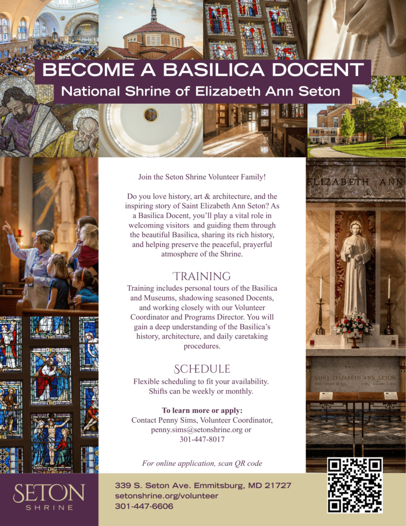 Join the Seton Shrine community in a special way by volunteering! There are a number of ways to become involved, including liturgical ministries at Mass, hospitality in the museum and Basilica, helping hands for retreats, and much more. Volunteers can choose any schedule that works for them, whether that’s monthly, weekly, or just once in a while. The Shrine is truly grateful for the wonderful community of volunteers here, as each play such an invaluable role in continuing the mission of promoting Mother Seton’s life and legacy. We would love to have you join the Shrine volunteer family too!